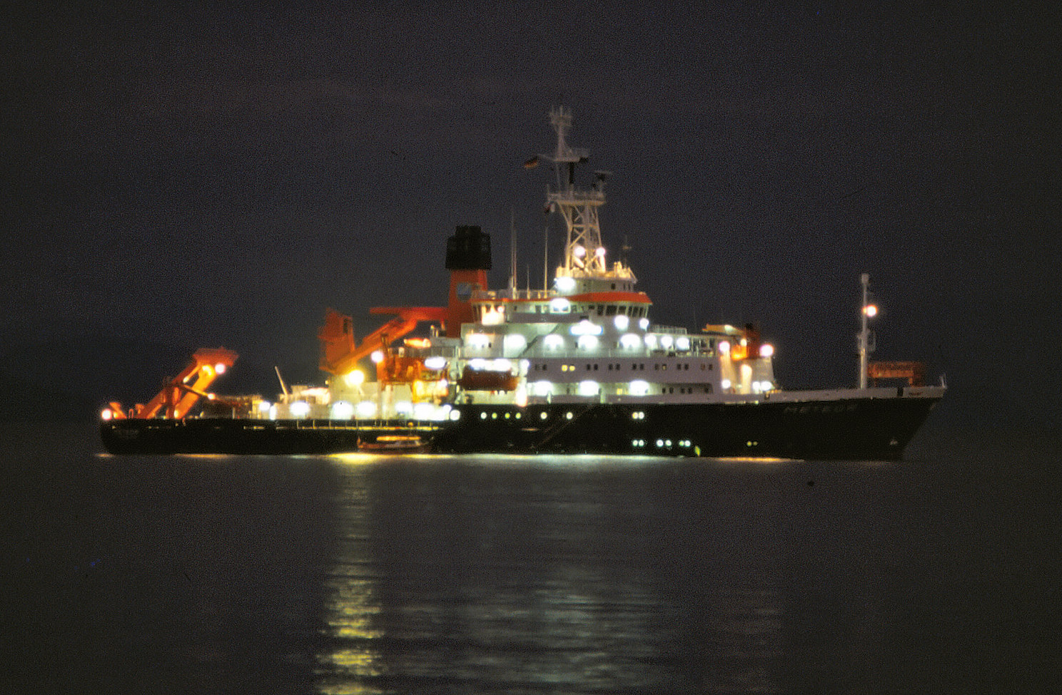 Etwa 3 Monate später nach den Ereignissen in Djibouti liegt die Meteor vor Nosy Be (eine Insel vor der Küste Madagaskars) auf Reede, fotografiert bei einem Landgang am Abend. Die Meteor-Reise Nr. 5, MINDIK, war die erste längere Expedition des 1986 in Dienst gestellten und damit damals jüngsten Forschungsschiffes der Bundesrepublik Deutschland. Wie ihre Vorgängerin hatte auch die neue METEOR für ihre große Bewährungsprobe als modernes, multidisziplinär einsetzbares und technisch hoch entwickeltes, meereskundliches Forschungsinstrument das Mittelmeer, das Rote Meer und den westlichen Indischen Ozean zum Ziel.