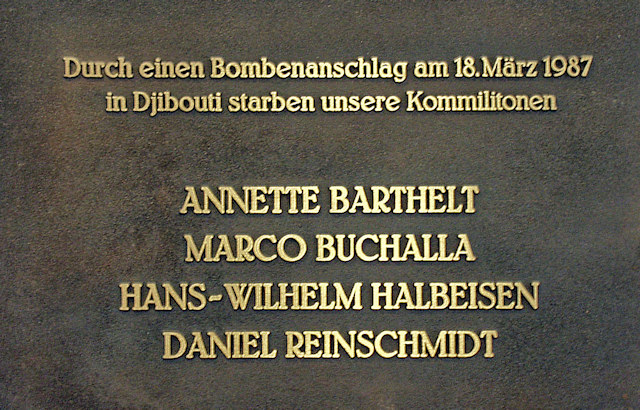 Zum Gedenken an die Terroropfer von Djibouti, Annette Barthelt, Daniel Reinschmidt, Marco Buchalla und Hans-Wilhelm Halbeisen, die durch einen Bombenanschlag am 18. März 1987 kurz vor ihrer Teilnahme an einer grossen meereswissenschaftlichen Expedition in den Indischen Ozean aus dem Leben gerissen wurden. Im Januar 1987 legte das deutsche Forschungsschiff Meteor 3 zu einer knapp zehnmonatigen Expedition ab. Für vier junge Forscher wurde es eine Reise in den Tod, für vier weitere zu einem Horrorerlebnis, das bis heute nachwirkt. Der Anschlag von Djibouti war ein im Auftrag Libyens durch eine palästinensische Terrororganisation in Djibouti ausgeführter Anschlag. Bei dem Terroranschlag am 18. März 1987 wurden 13 Personen getötet und 41 weitere verletzt.